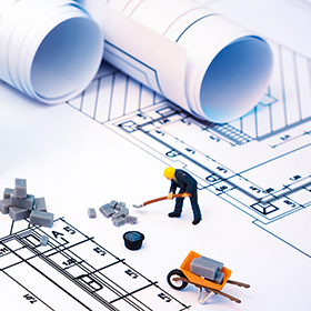 building house on blueprints with worker – construction project